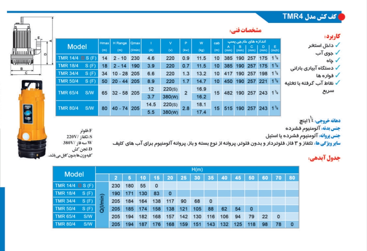 کف کش توان تک ۵۰ متری 1/4_1 اینچ ( لوله 4 ) بدون فلوتر تکفاز خروجی بغل TMR50.4 | پمپ کفکش ایرانی 1/25 اینچ 2/5 اسب تک فاز