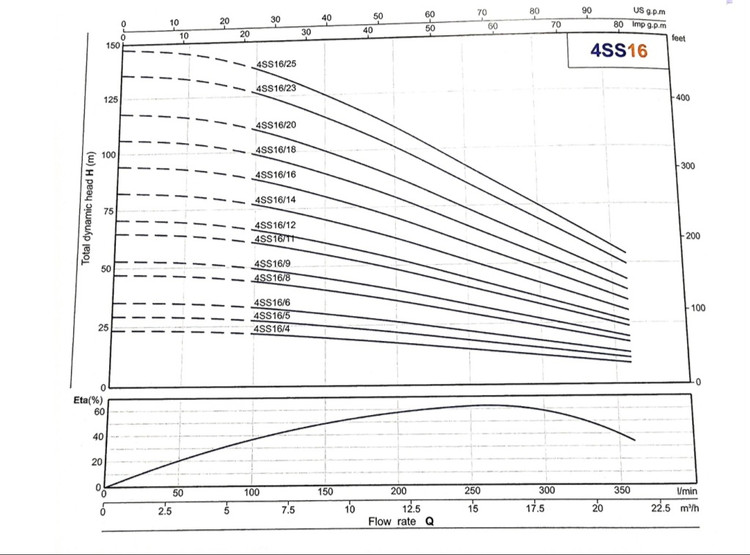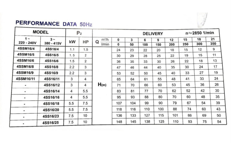 حداکثر آبدهی در ارتفاع ۱۹ متری: ۳۵۰ لیتر در دقیقه
