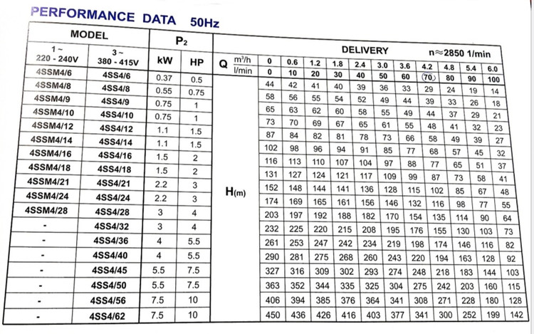حداکثر آبدهی در ارتفاع ۱۹۴ متری: ۷۰ لیتر در دقیقه
