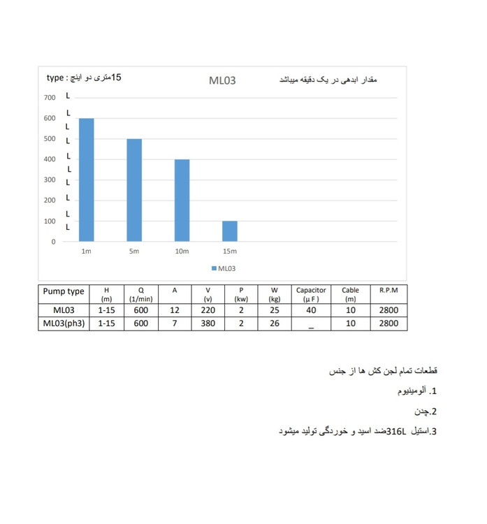 لجن کش تمام استیل ۱۵ متری ۲ اینچ ۲/۷ اسب تک فاز ملل مدل MELAL- ML03 | پمپ لجنکش تکفاز ایرانی کامل استیل ضد اسید و ضد سایش و خورندگی