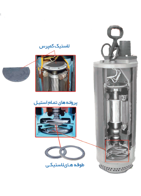 ⇐ در واسطه بالایی پمپ های اس پی،لاستیک مخصوص کمپرسی قرار گرفته که در صورت عدم استفاده از تابلو های کنترل الکترونیکی دقیق بهر دلیلی دینام فوق بسوزد و فیوز برق را قطع نکند و همچنان پس از سوختن،جریان برق برقرار باشد،لاستیک فوق تمامی فشار ایجاد شده در الکتروموتور را هدایت و در نهایت با پاره شدن،فشار داخل را به بیرون منتقل می کند، که اینکار مانع از ترکیدن دینام می شود.
