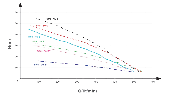 ⇐ ⇐ از خصوصیات بارز پمپ های SP انتقال آب از قسمت فوقانی پمپ و دارا بودن حداکثر قطر خارجی 195 میلیمتر است که میتواند برای انتقال از چاههای حفاری شده با قطر 8 اینچ به بالا مورد استفاده قرار گیرد.
