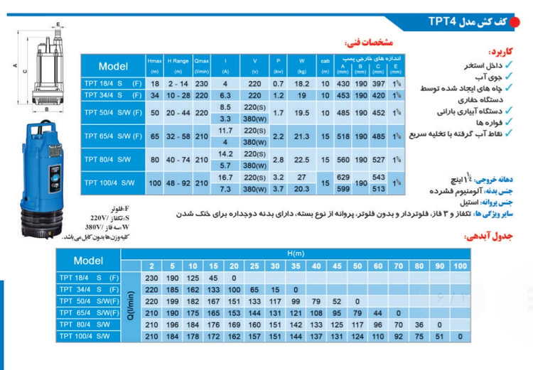 پمپ کفکش توان تک ۱۰۰ متری 1/4_1 اینچ خروجی از بالا سه فاز بدون فلوتر (لوله4) TPT100.4.3PH | کف کش ایرانی 1/25 اینچ 4/3 اسب 3 فاز